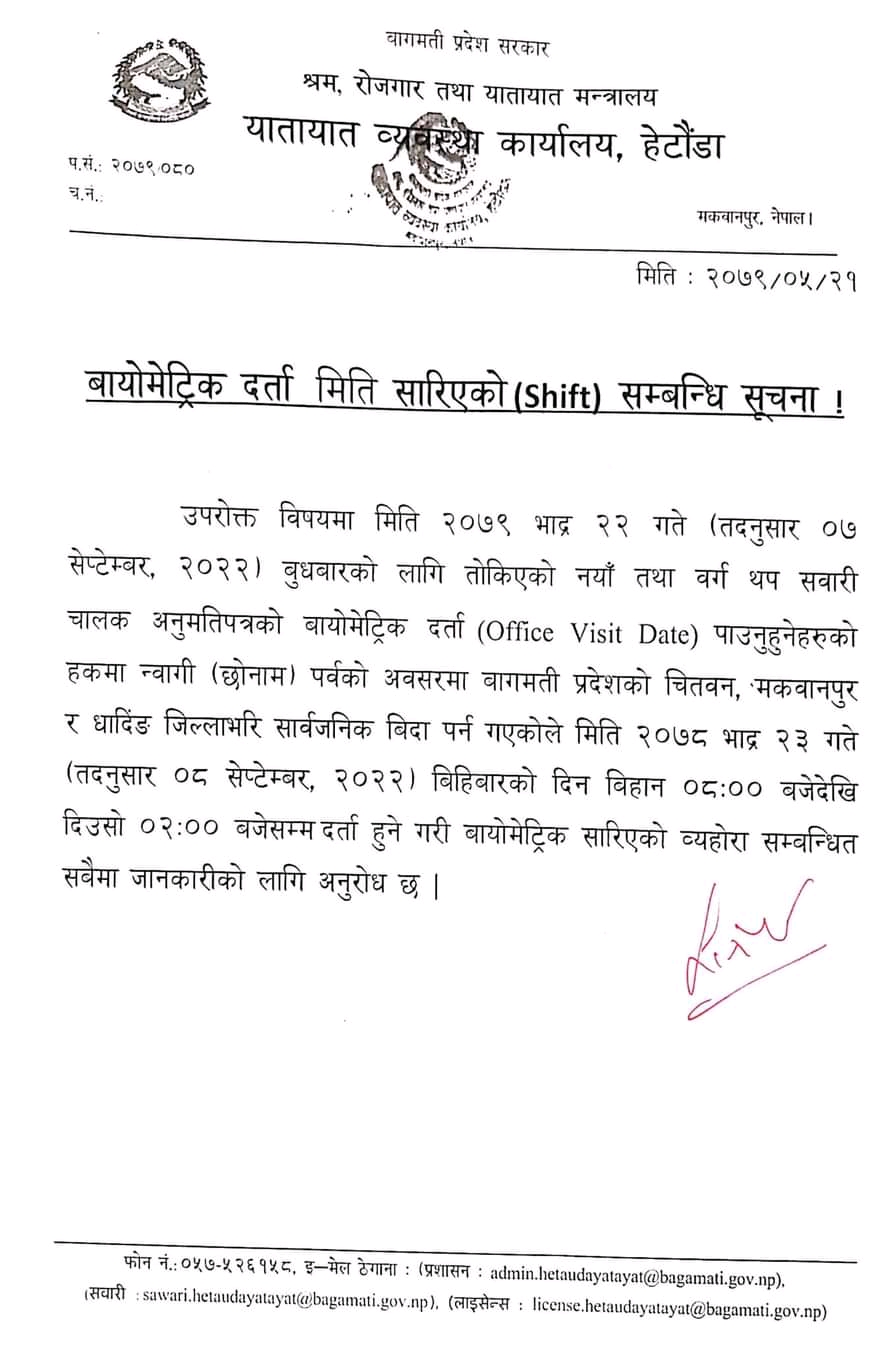 transport management office hetauda has published notice regarding visit shift. Fot more info you can see the notice below.