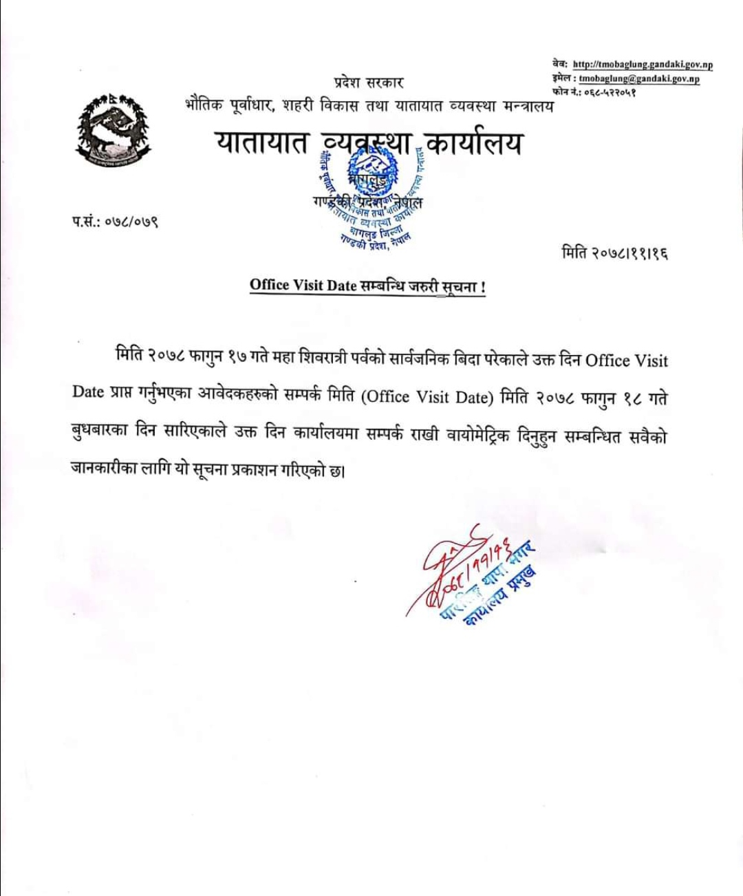 Transport office baglung published notice about visit date postponed . Dhaulagiri yatayat baglung postponed tomorrow 2078-11-17 visit date which will…