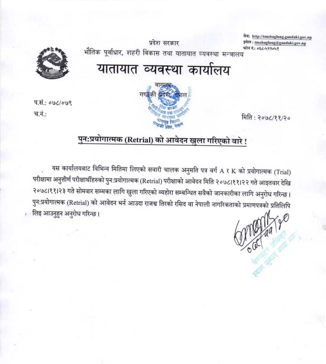 After a long time transport office, Dhaulagiri bag lung has published Retrial Notice. People can fill up their Retrial form…