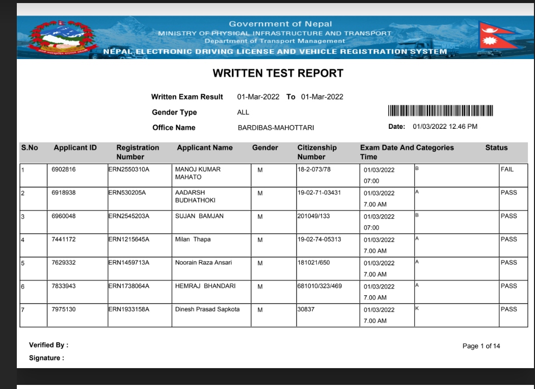 Written exam result out 2078-11-26 bardibas yatayat