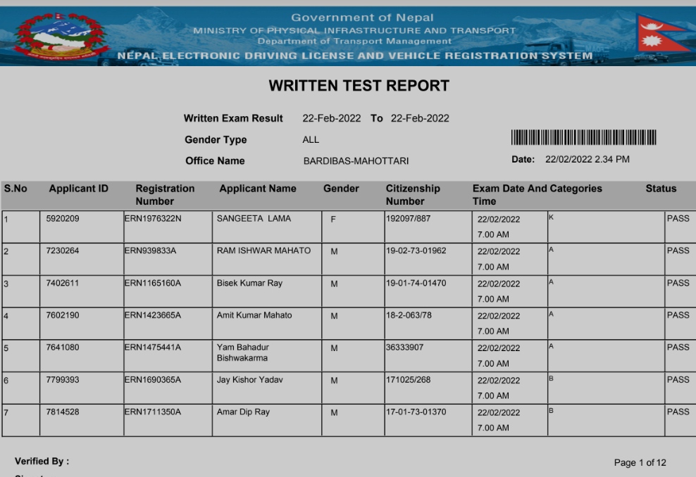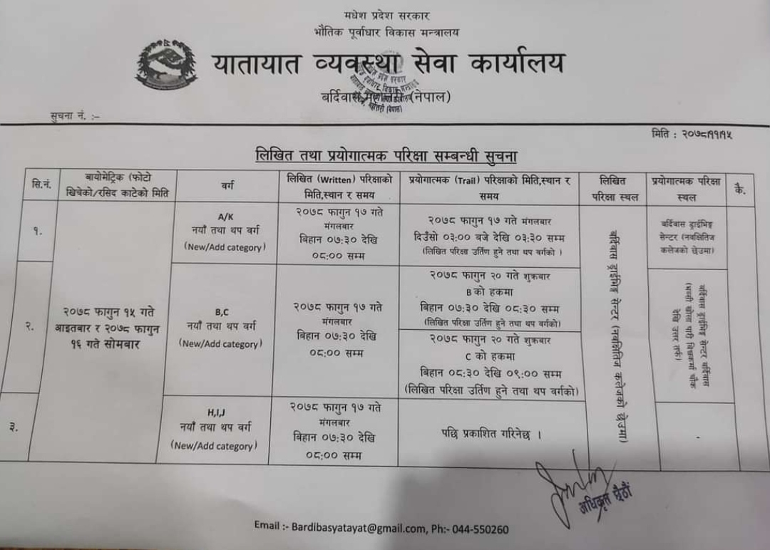 bardibas yatayat published weitten and trial date schedule for tjose who have completed their biometric test in 2078-11-15 amd 16…