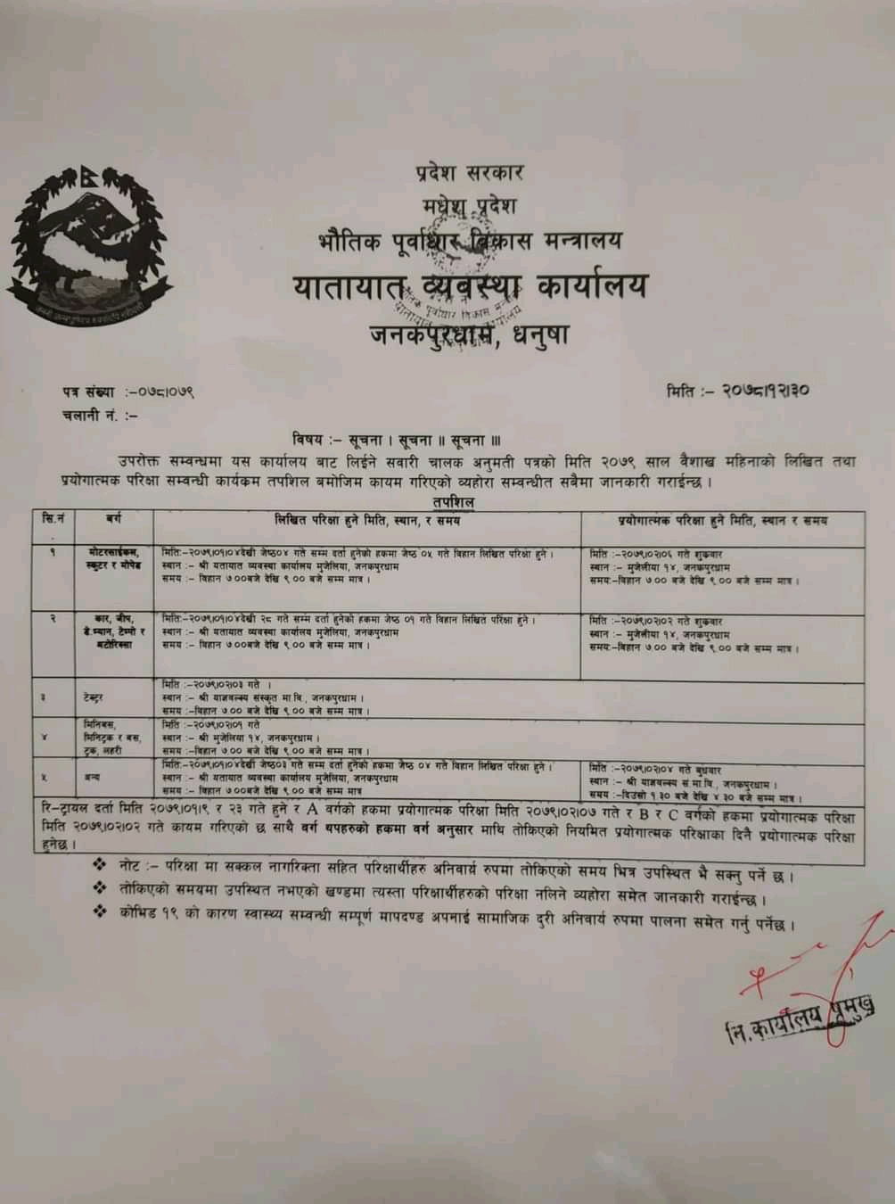 transport management office janakpur janakpurdham has published notice regarding new modality of trial. This notice is applicable from 2079-06-01 for…