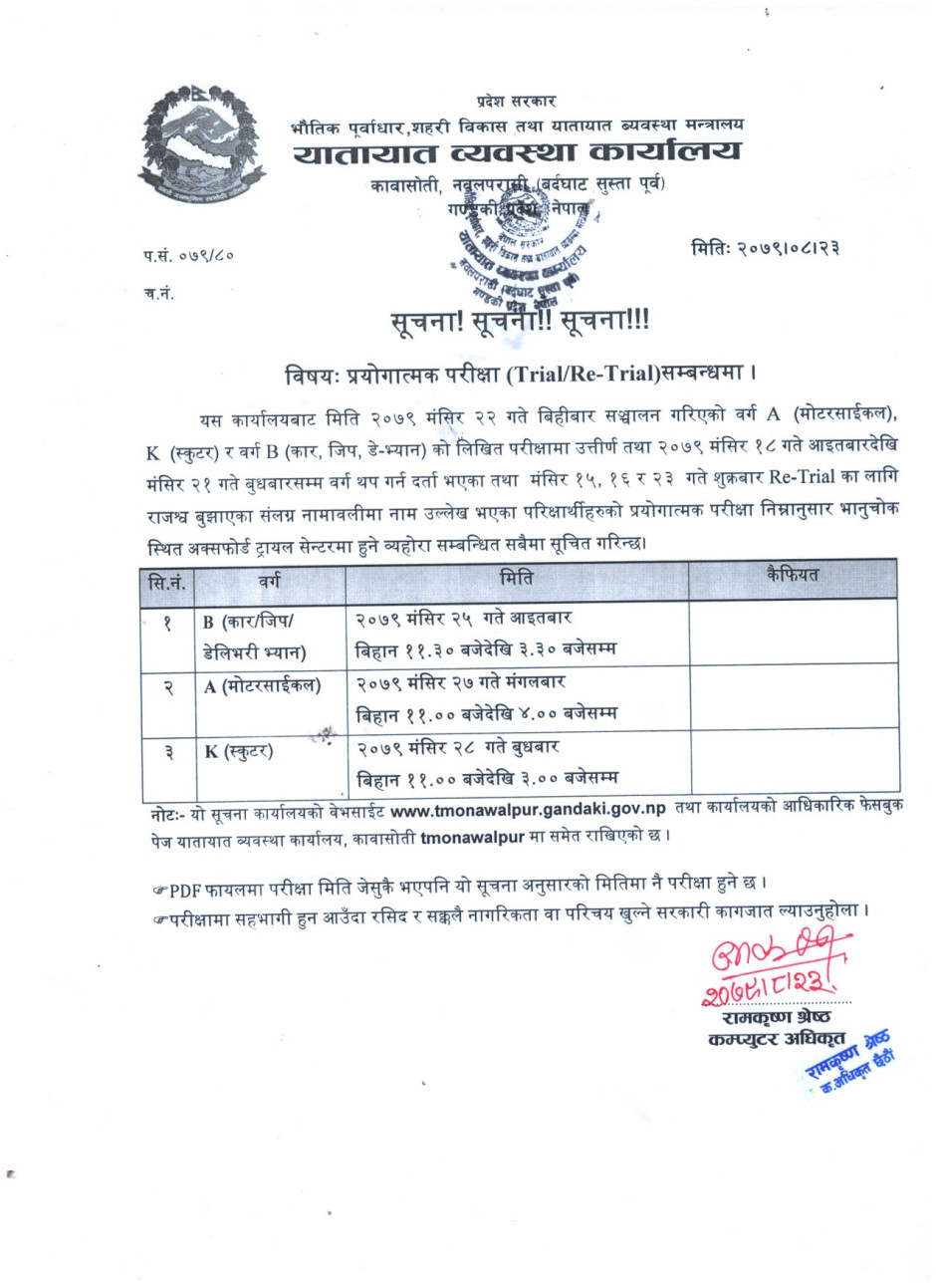 Transport management office Nawalparasi has published important notice regarding trial date . This notice is applicable for those people who…