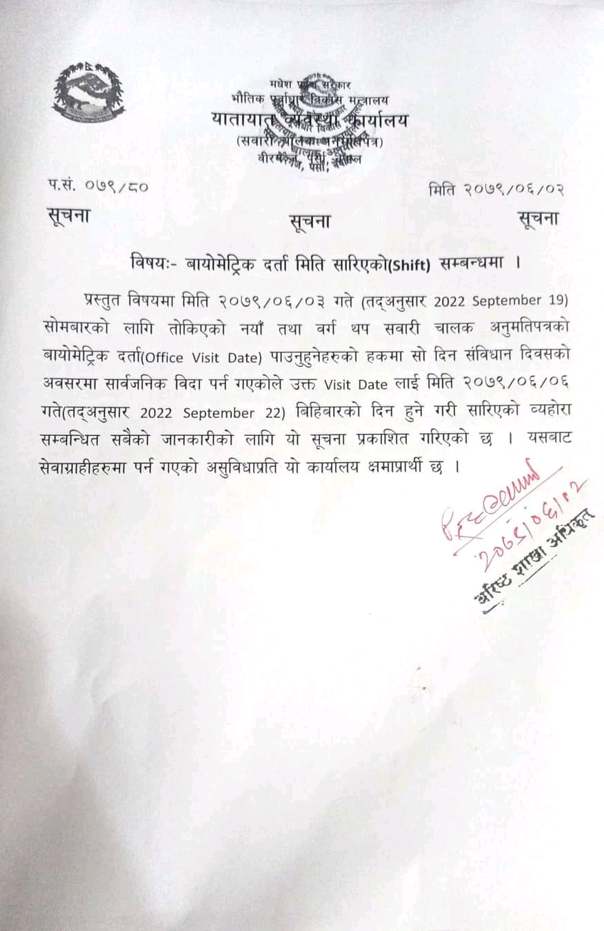 transport management office narayani hetauda has published notice regarding visitdate shift . For more information you can see notice below.
