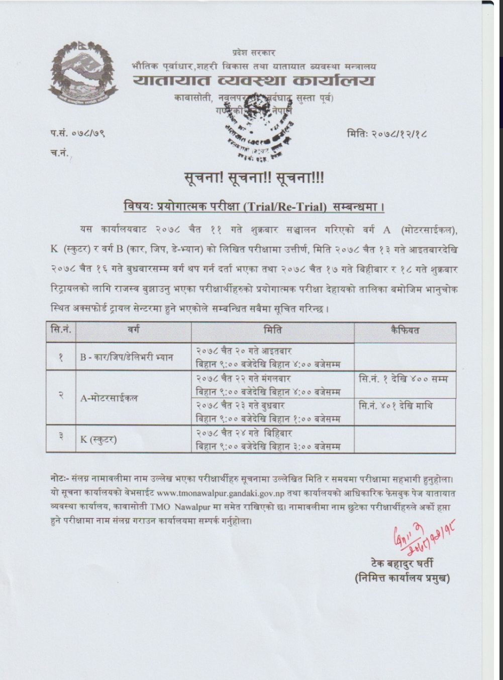 Transport management office nawalparasi has published notice regarding trial and retrial exam. Which is going to be conducted from 2078-12-20.…