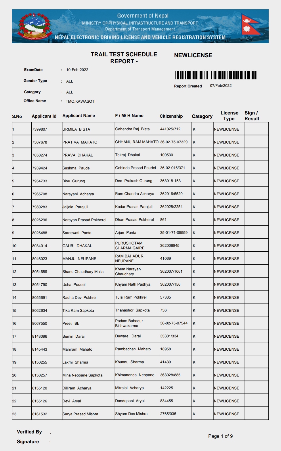 Transport management kawasti published name list of category Bike and Scoter which is going to be conduct from 2078-10-25 .…