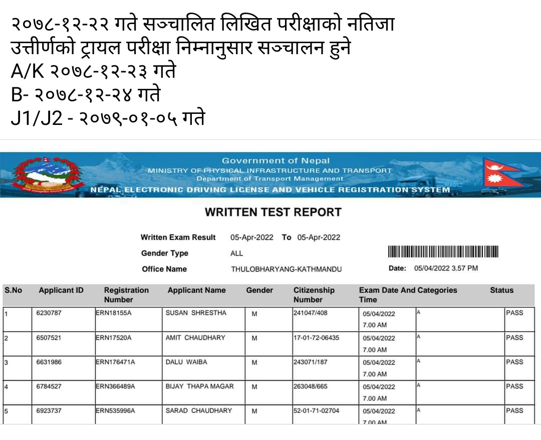 Written exam result out 2078-12-22 thulo bharyang yatayat