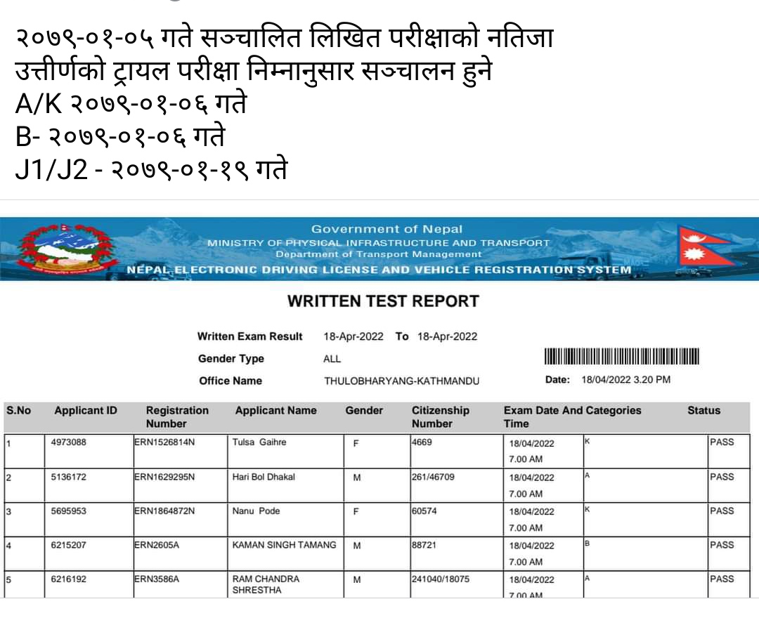 transport management office kathamnadu thulo bharayang has published written exam result which was taken in today morning . Now you…