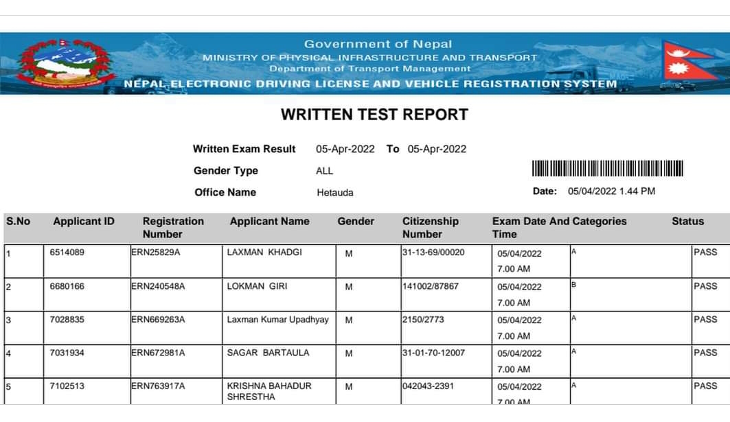 Written exam result 2078-12-22 hetauda yatayat