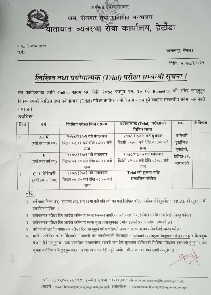 Hetauda yatayat narayani has published notice regarding writtem and trial date exam. This notice is applicable for those who done their biometric test in 2078-11-29 and 30. for more details you can see the notice below.